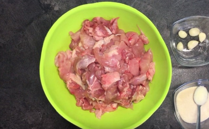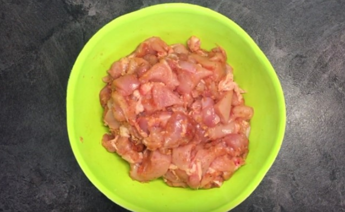 Для этого рецепта можно брать все части курицы, жир выбрасывать не следует, чтобы колбаса не получилась сухая. Удалить все кости и порезать на кусочки.