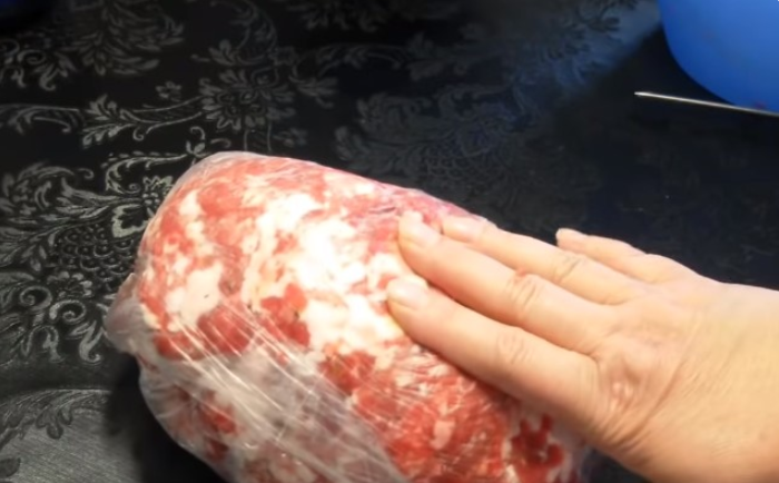 Стелем на стол пищевую пленку, выкладываем фарш (первую порцию) и заворачиваем в виде колбаски, концы пленки завязываем. Если вы заметили пузырьки воздуха, проткните их зубочисткой. Затем заверните еще в один слой пленки. Так поступаем со всеми заготовками и кладем в холодильник на 1 день. Лучше уложить в рукав для запекания, мясо сдвинуть в одну сторону и туго закрутить рукав, концы завязать.