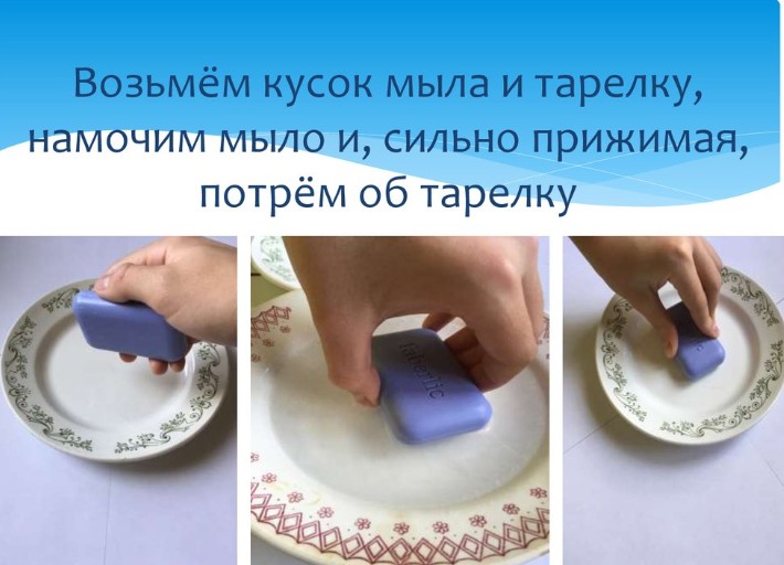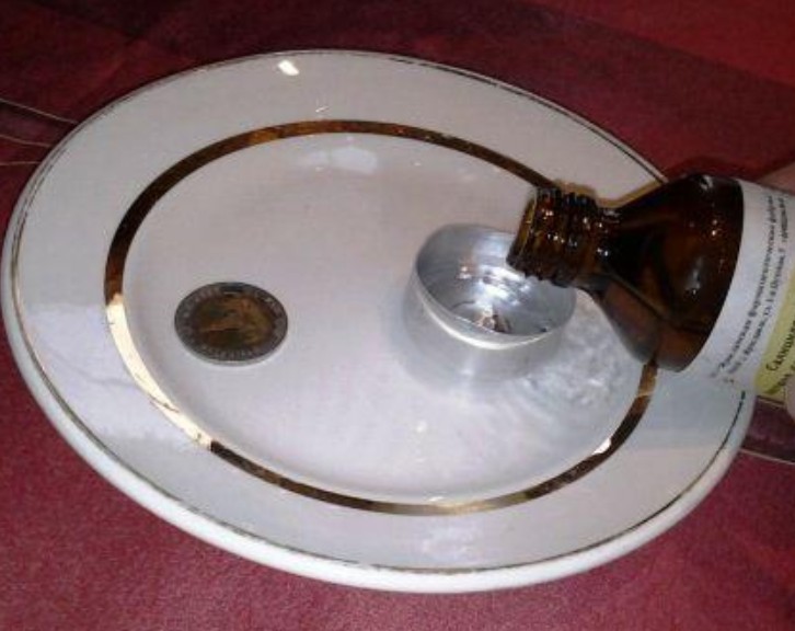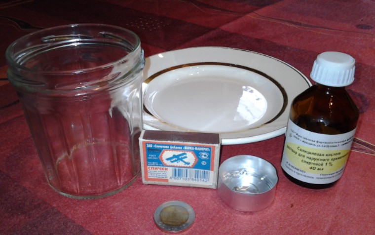 Приготовьте: тарелку небольшого размера, воду, мелкий предмет (пуговицу, ключ, монету), банку или стакан, стаканчик от маленькой свечки, салициловую кислоту (1%), спички.