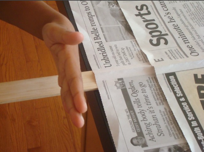 На стол положите рейку, таким образом, чтобы один конец свешивался на 10 сантиметров, сверху плотно к столу и рейке положите газету. Ударяйте резко тыльной стороной руки по концу рейки. Рейка сломается, а газета не порвется. Воздух оказывает давление на газету. Медленное нажатие способствует проникновению воздуха под газету и уравновешивает давление. Если ударять резко , благодаря инерции воздух не успевает быстро проникнуть под газету. Рейка ломается, так как на газету давление воздуха сверху больше.