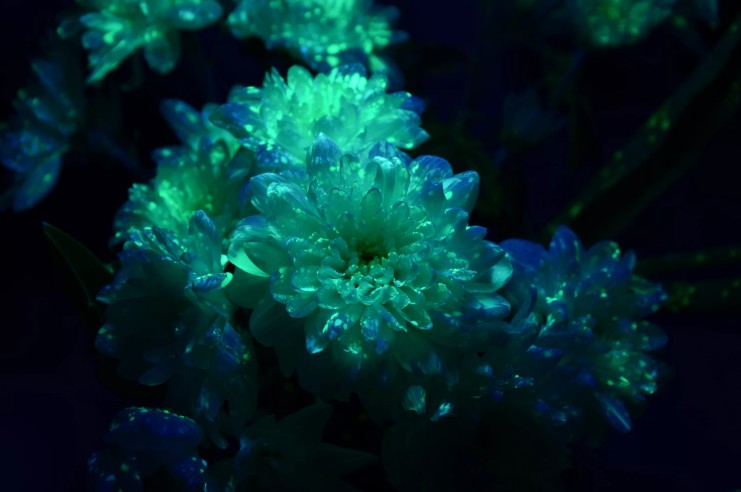 Приготовьте маркер, выделяющий текст. Лучше всего под черной лампой светится желтый. Из маркера нужно вытащить волокна с чернилами. В емкость с водой выдавите чернила и поместите цветок туда. Нужно подождать пару часов, чтобы цветок впитал чернила. После этого можно наблюдать, как светятся лепестки под лампой черного света.
