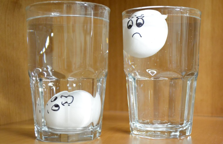 Стаканы наполняем водой. В одном стакане растворяем две ст.ложки соли, в каждый стакан опускаем по яйцу. В соленой воде яйцо будет плавать на поверхности, а в обычной утонет. Объяснение этому — с помощью соли плотность воды повышается, поэтому легче плавать в соленой воде.