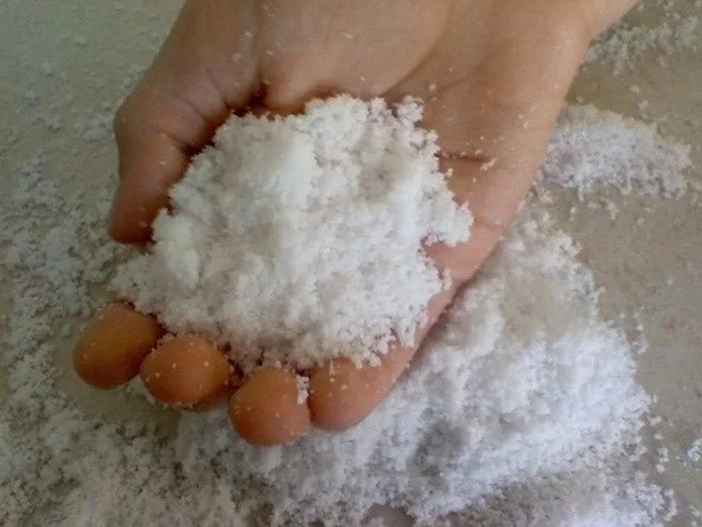 В кастрюлю налейте уксус и добавьте соду. Вы увидите реакцию — выделение пузырьков газа. Ждите пока пузырьки исчезнут и ставьте кастрюлю на плиту. Помешивайте постоянно, при этом будет испаряться лишняя влага. На стенках кастрюли должны появиться кристаллы белого цвета, это раствор ацетата натрия. Раствор должен остыть, а на его поверхности появиться корка. Если этого не произошло, продолжите выпаривание. Затем подливайте горячую воду небольшими порциями, корка должна исчезнуть, а раствор станет однородным. Раствор перелейте в банку и уберите в холодильник, чтобы он охладился до комнатной температуры. Достаньте банку из холодильника и добавьте немного соли. Вы увидите, что раствор начнет кристаллизоваться и станет похож на лед.