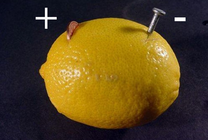 Оказывается, лимон может вырабатывать ток химического характера. Приготовьте: лимон, скрепку или гвоздик, медную проволоку или медную монетку, светодиод, два проводка.