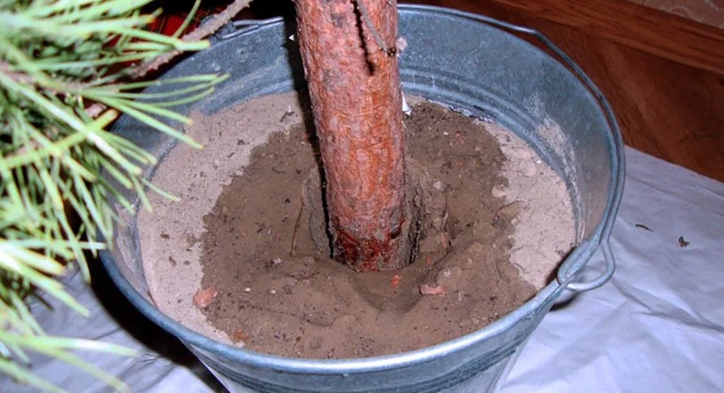 - Если елка стоит в песке, по мере высыхания, его следует проливать холодной водой, добавив в нее по ложке соли и сахара либо таблетку аспирина.