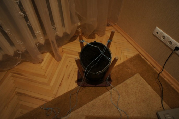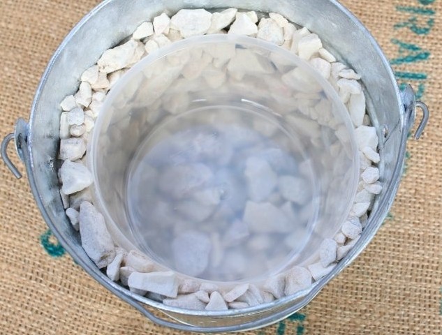 Сверху поместите пластиковый контейнер, он нужен для того, чтобы во время полива, в нем оставалась вода.