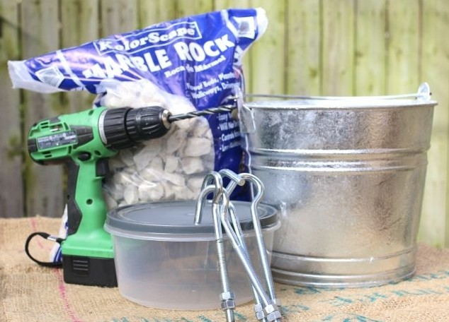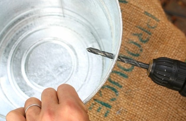 Наметьте 4 отверстия в верхней части ведра и просверлите их.
