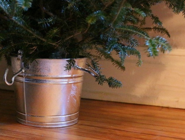 Если у вас елка большая, ее необходимо закрепить, чтобы избежать ее падения. Для этого ведро с песком и елкой вставьте в перевернутый кухонный табурет, привяжите ствол к ножкам веревкой.