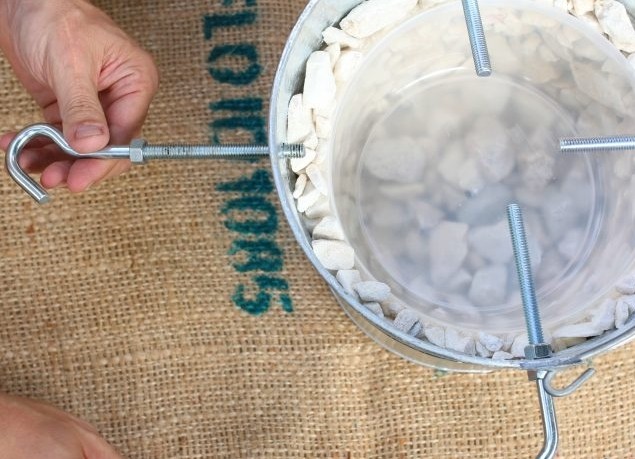 Вставьте ствол, крючки затяните болтами так, чтобы они в него упирались, пластиковый контейнер наполните раствором.