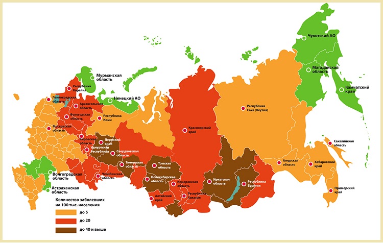 Клещ распространен на всей территории РФ, карта покажет те регионы, в которых укусов и заболевших на энцефалитную инфекцию больше всего: