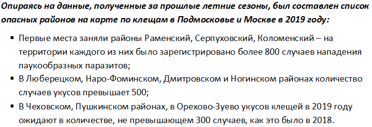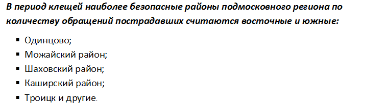 За весь период не было ни одного случая инфицирования от клеща. Даже не смотря на это, к самым опасным регионам, в которых может находиться энцефалитный кровопийца, относят следующие районы: