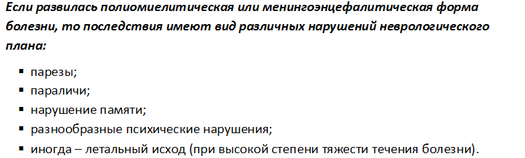 Смерть наступает у 10 % заболевших малышей. Парализованные ручки один из распространенных видов осложнений, он наступает в 30 %. Возможна временная потеря координации, движений, дрожание мышц. Существуют случаи, когда ребенок остался носителем этого вируса на всю жизнь, несмотря на то, что он практически выздоровел.