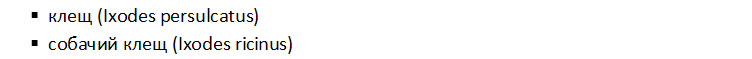 Переносчиками инфекции в этом случае есть животные, клещ передает инфекцию тому, кого кусает. Также заражается и его потомство.