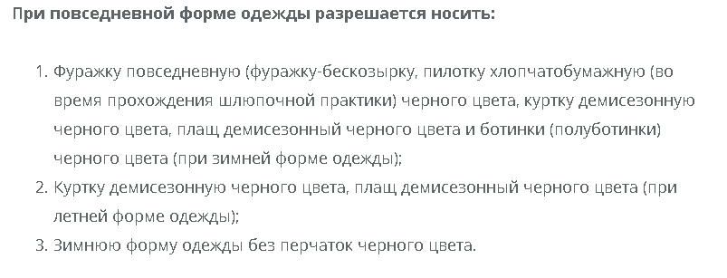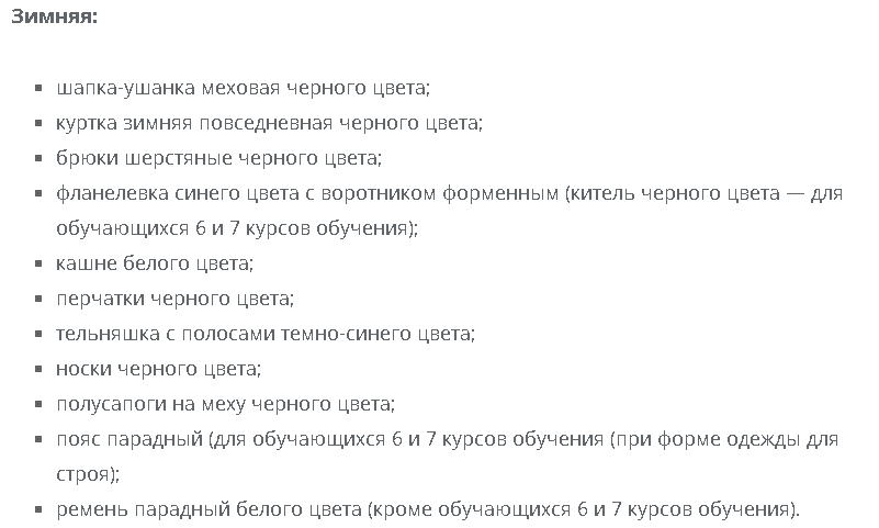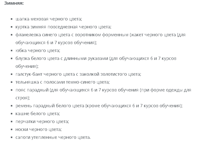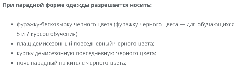 Кадетская форма, погоны, знаки различия являются гордостью и обязывают строго исполнять правила поведения, как в учебном заведении, так и вне его. Она должна быть всегда в безупречном виде, подогнанной по фигуре и росту, выглаженной и чистой.