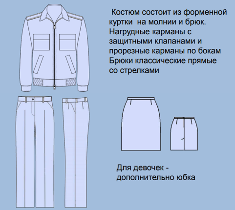 Комплектация формы и ее внешний вид для кадетских классов должны соответствовать учредительным документам и иметь в своем составе китель или куртку, брюки и головной убор. Для девочек комплект дополняется юбкой. На форму наносят установленные шевроны и нашивки с информацией о школе, классе, соответствующем ведомстве, ФИО учащегося и год обучения.