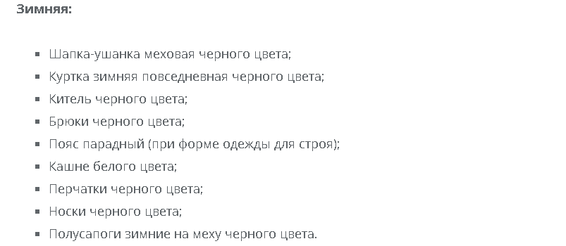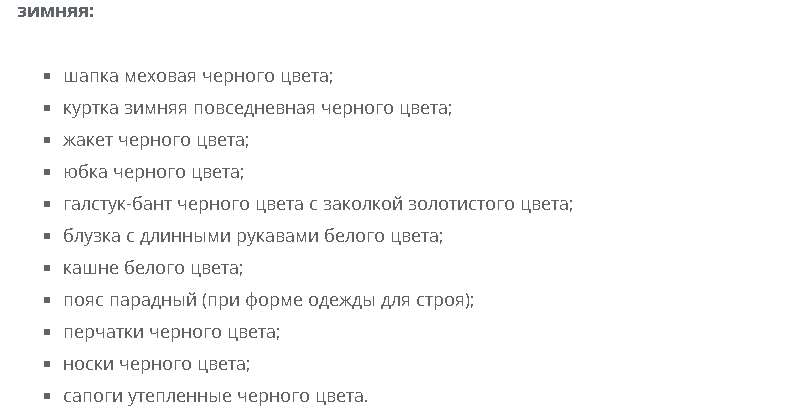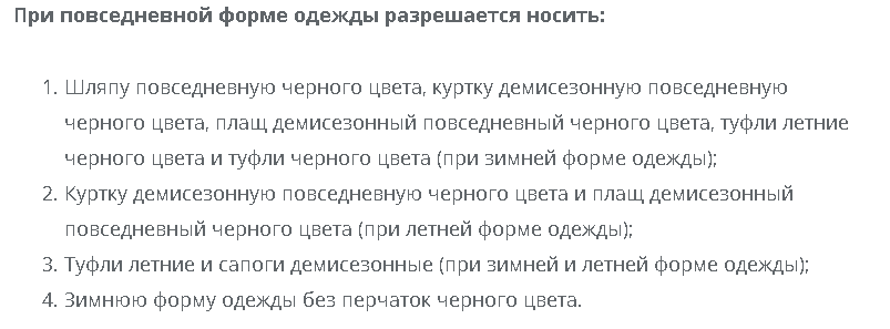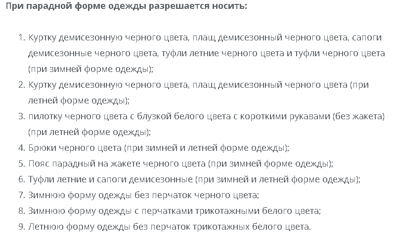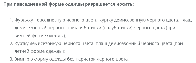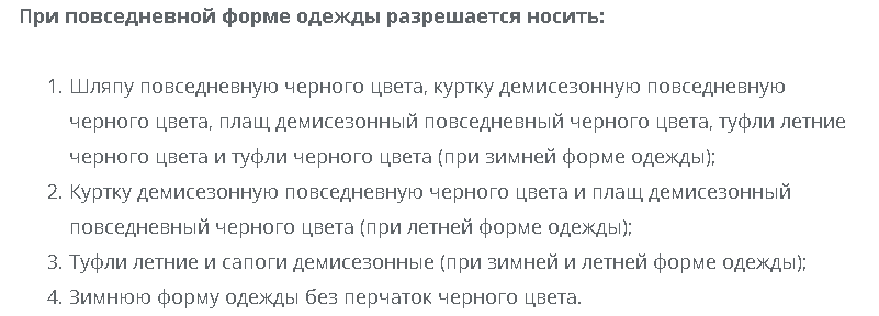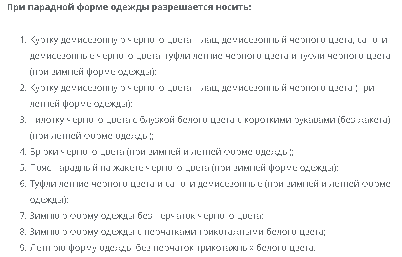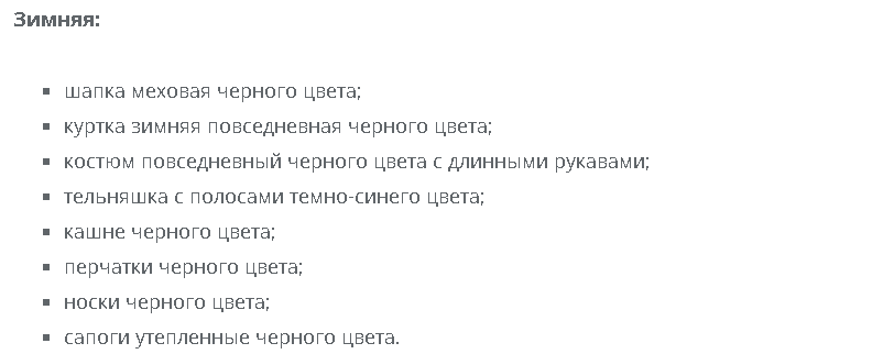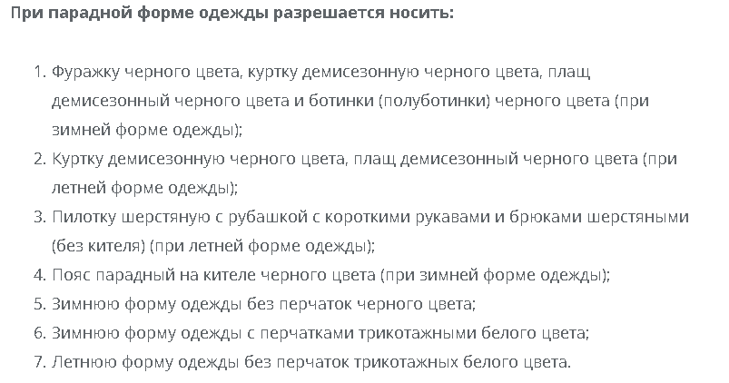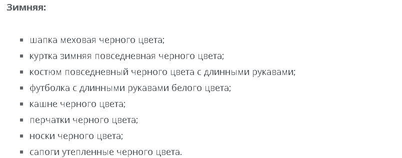 • атрибутика — аксельбанты, перчатки, ремни, шевроны, нашивки, кокарды.