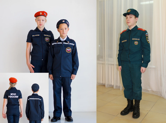 Для кадетов МЧС используют базовую повседневную  модель, на которую наносятся эмблемы МЧС, знаки отличия, ФИО учащегося, шевроны. В комплектацию входит соответствующий головной убор, обувь и аксессуары. Костюм является основой строевой и парадной формы.