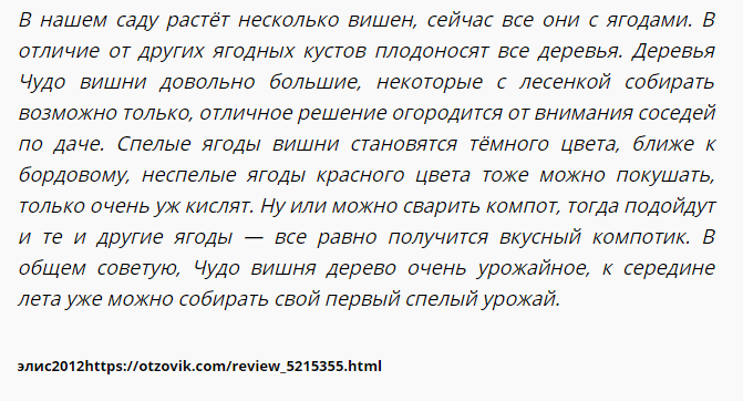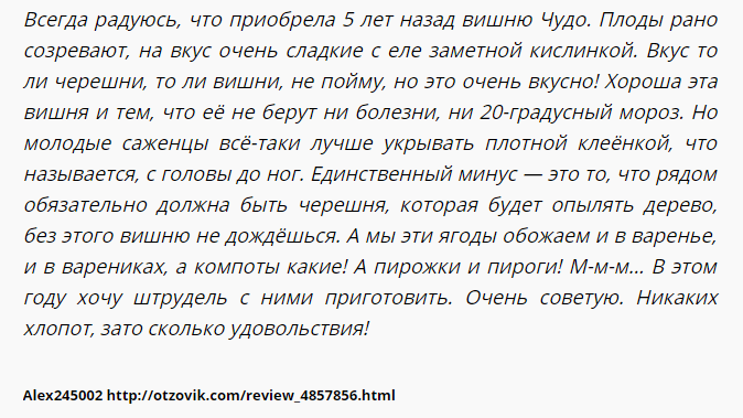 Суровые зимы 2005 и 2006 г.г. значительно не повлияли на урожай черевишни Кормилица восьмилетнего возраста.