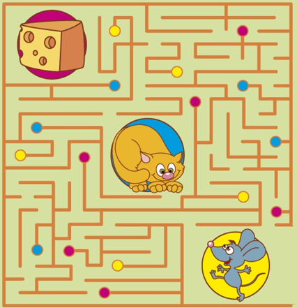 Найдите путь, по которому должна пройти мышь, чтобы не встретиться с кошкой.