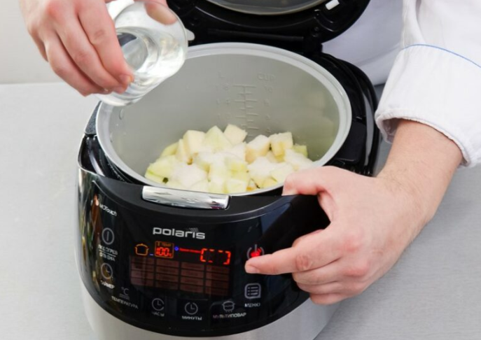 Добавляем воду (кипяток), перемешиваем. Режим выбираем — тушение, время — 2 часа.