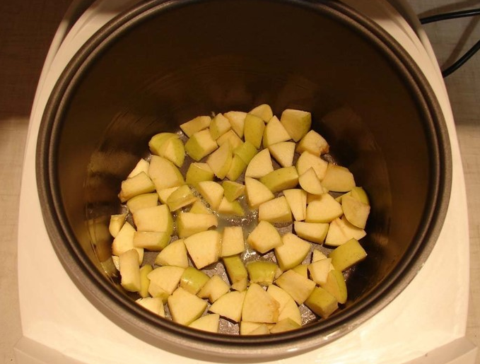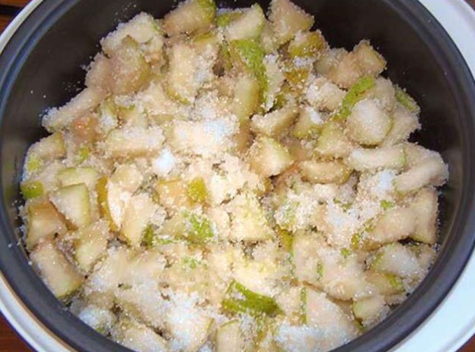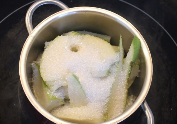 - После того, как помыли и обсушили плоды, снимите с них очень тонко кожуру, удалите сердцевину, нарежьте тонкими дольками и выложите во вместительную эмалированную кастрюлю.