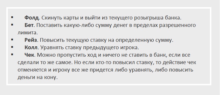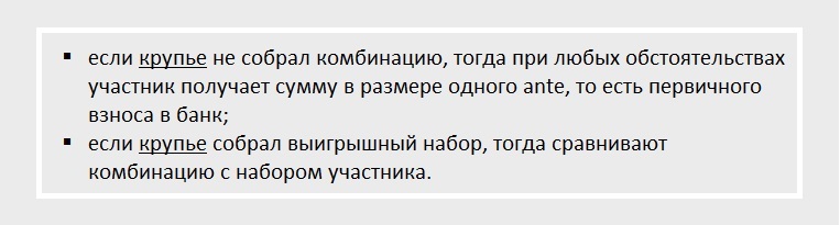 - Когда лучшая комбинации собирается на руках у играющего, ему переходит определенное количество фишек/денег из банка.