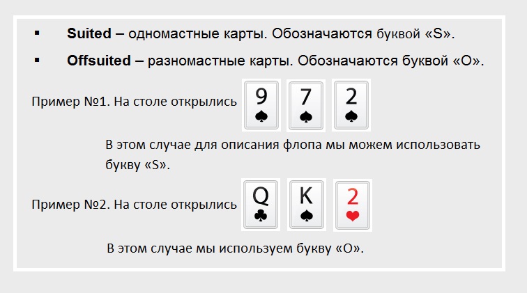 Кроме выше перечисленного значения, необходимо вести опись одномастной/разномастной карты. Для этого используется следующая аббревиатура.