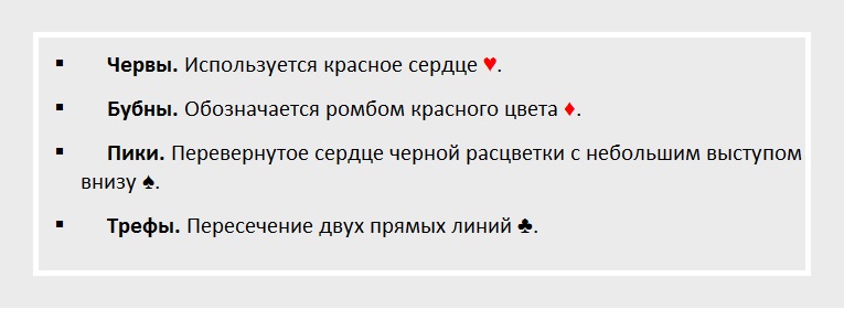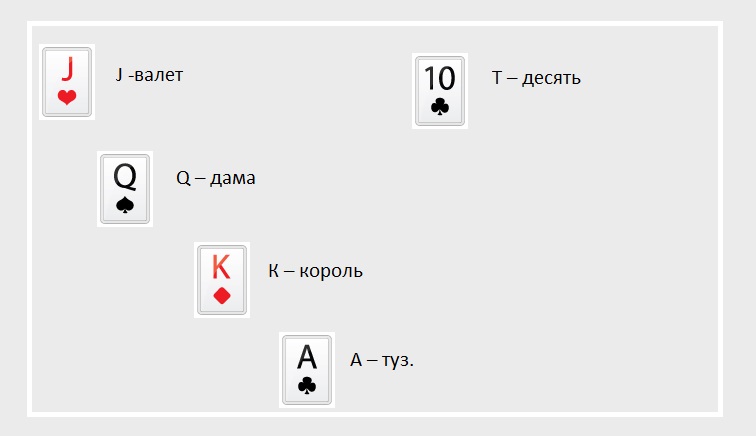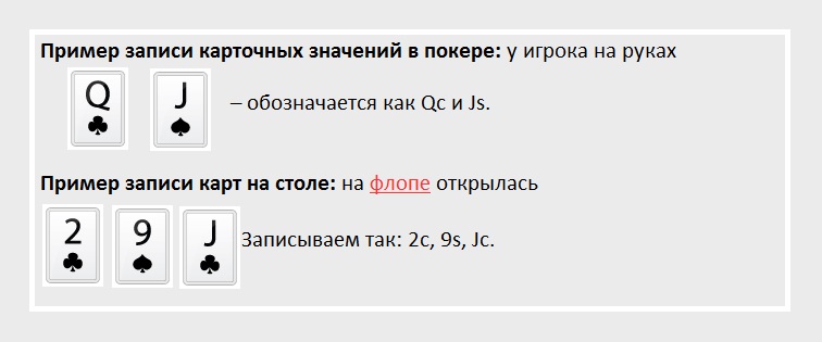Карта имеет символ и значение. С ним легко разобраться в повседневной жизни. А вот что касается покерных записей, тут не все так просто. Комбинации записываются сокращенной аббревиатурой. Для того, чтобы быть в курсе дела нужно знать эти тонкости.