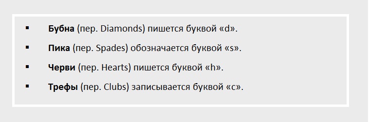 Такая запись признана во всем мире. Она состоит из английской буквы и цифры. Возможна русская транслитерация, например В,Д,Т,К. Но ее использование применяется крайне редко. Для покерных записей такое обозначение не приемлемо, так как не дает возможности описать масть.
