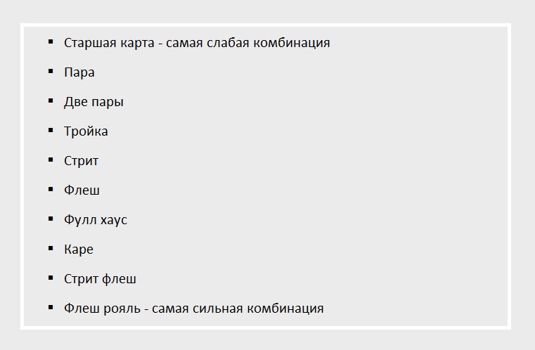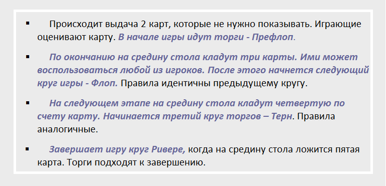 Игра очень смахивает на «Холдем». За исключением одного отличия, порядка комбинаций к выигрышу.