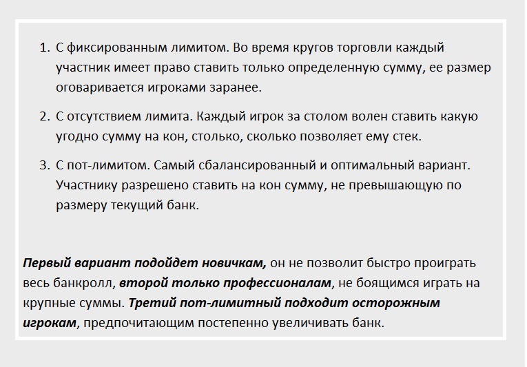 Игра может иметь несколько лимитов. О них участники говорят в самом начале, только после этого приступают к выдаче карты. Лимиты одинаковые для всех видов покера.