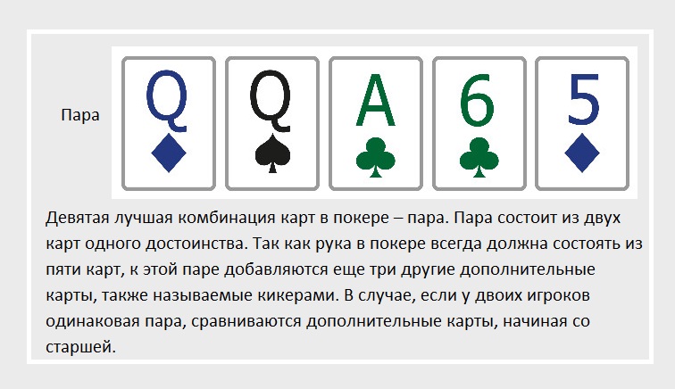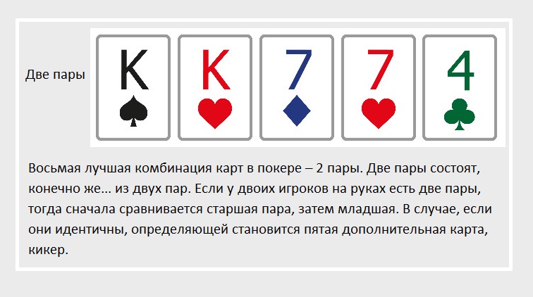 Важно! В русском виде покера существуют двойные стандарты/комбинации. Вторая пара карт состоит минимум из двух и они разные по старшинству. Если ваши с дилером/крупье комбинации одинаковые, разрешить ситуацию может только «Кикер». Тогда состоится своего рода ничья, никто ничего не потеряет и не приобретет.