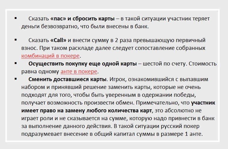 Оценив свою комбинацию, участник вправе выбирать дальнейшие действия: