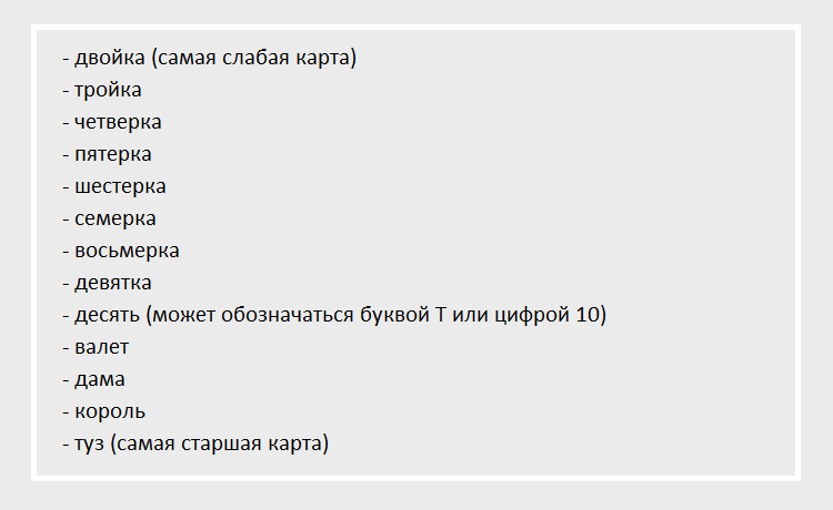 Карта делится по рангу. Обычно ее обозначают по стандарту. Отличаться от стандарта может только 10. Ее обозначают как «Т» или «ten», что значит «10».