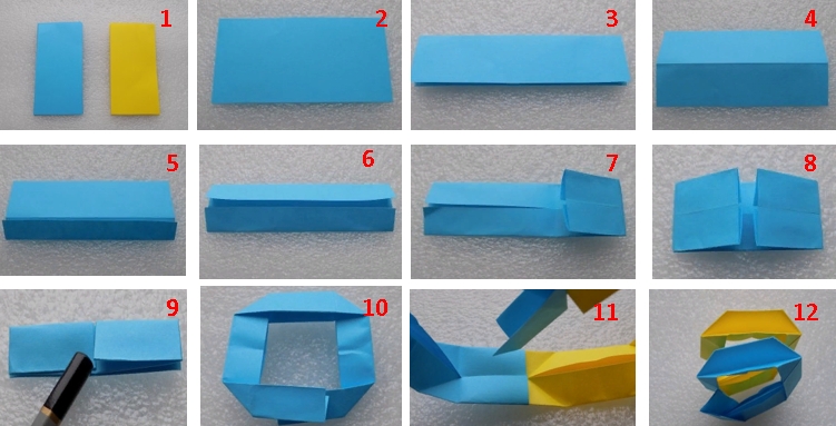 Для пружинки используются несколько цветов, так она будет выглядеть гораздо интереснее. Вырежьте прямоугольники, размером 6 на 12 сантиметров, сложите их вдвое. От их количества зависит длина готового изделия. В данном примере — по 10 листов желтого и голубого цветов. Предлагаем, так же, использовать пошаговую фото-инструкцию.