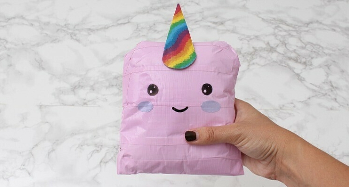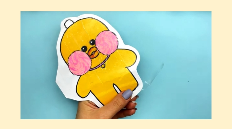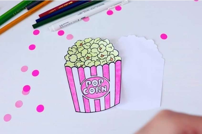 По вышеописанному принципу можно сделать сквиш любой формы. Нарисуйте на листе бумаги стаканчик с поп-корном, вырежьте две детали, разукрасьте, проклейте по контуру, отверстие оставьте в верхней части. Заполните наполнителем и заклейте. А чтобы игрушка была глянцевой всю поверхность обклейте широким скотчем.