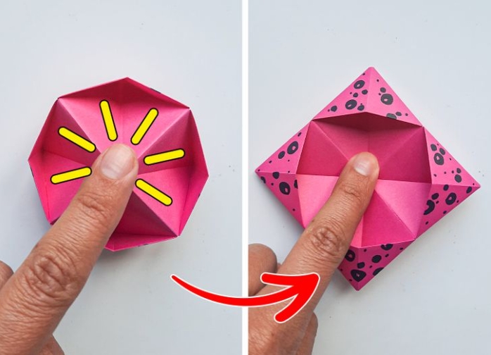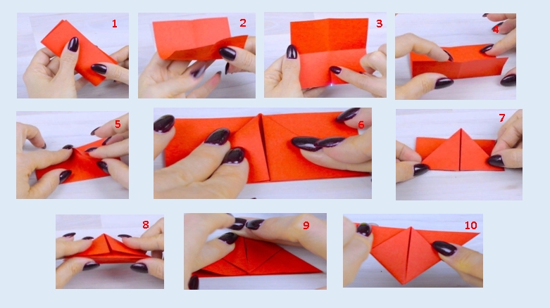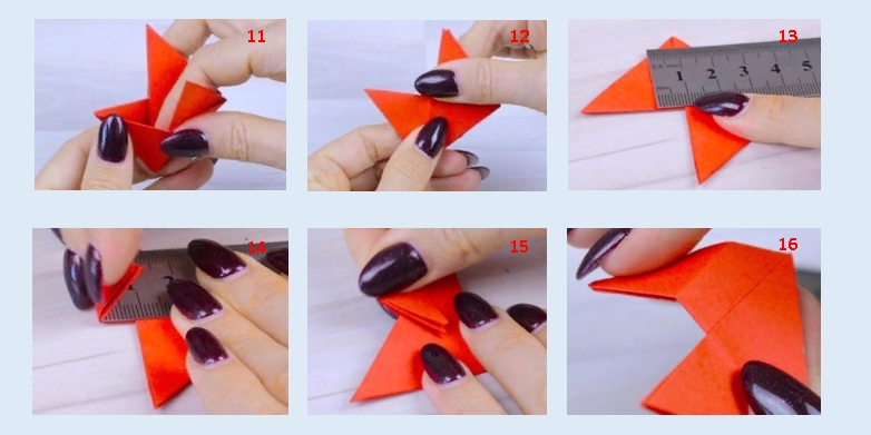 Подготовьте лист бумаги яркого цвета, в конце работы по своему желанию игрушку можно разукрасить. Следуйте схеме, представленной ниже.