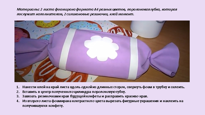 Этот материал воздушный, легкий, пенистый, можно купить в магазине. Он обладает неплохими свойствами — не промокает и долго держит форму. Предлагаем сделать мягкую конфету.