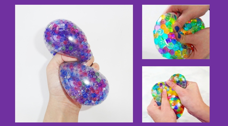 Данный материал можно приобрести в магазине или сделать самостоятельно (об этом в материале ниже). Так же, вам понадобится мелкочешуйчатая сетка. Растяните шарик и поместите внутрь слайм, перевяжите узлом кончик. Заверните игрушку в сетку, завяжите. Когда вы будете шарик сжимать в руке, появятся мелкие пузырьки.