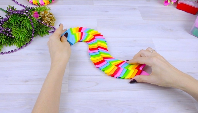 На завершающем этапе нужно соединить разноцветные элементы, чередуя их между собой (фото 11 и 12).