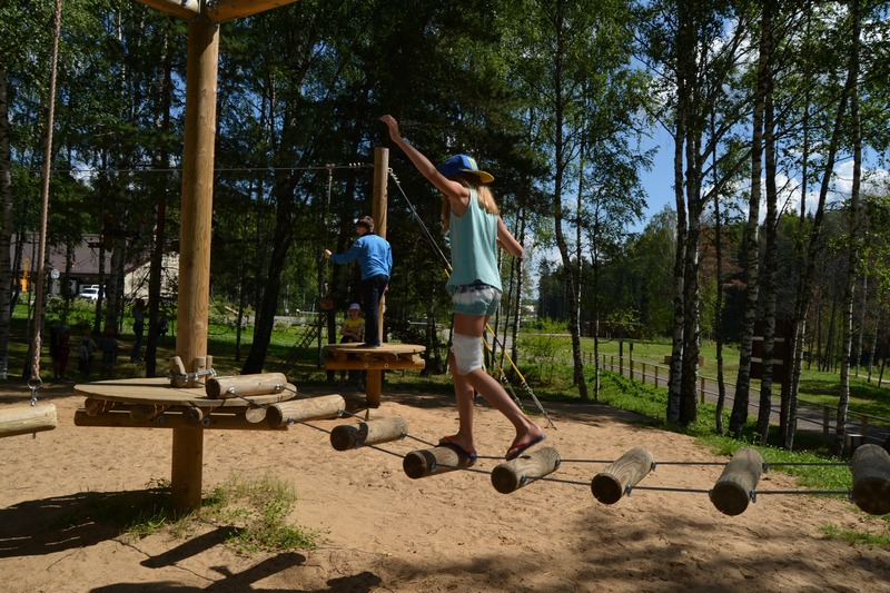 Ребята проходят к веревочному городку. Задача каждого игрока как можно быстрее пройти подвесной мост и не упасть в «реку». Команде, в которой есть упавшие добавляется + 20 секунд.
