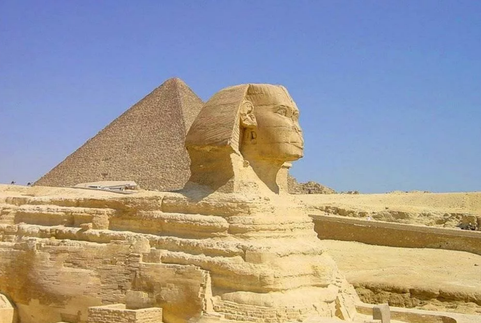 Большой Сфинкс представляет из себя льва с лицом человека. По версии ученых, его построили значительно раньше пирамид. Когда-то между лапами Сфинкса находилось святилище.