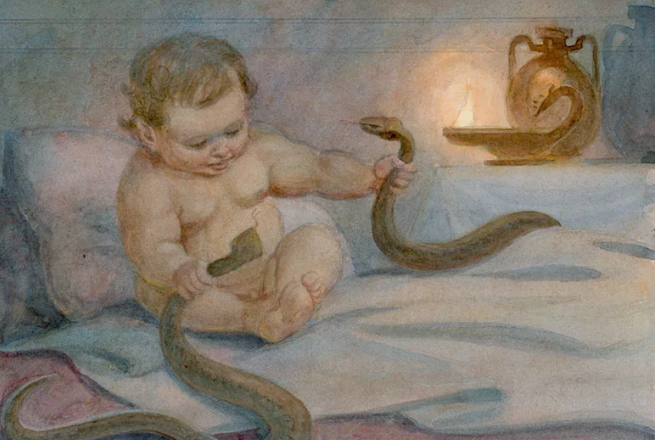 Главным богом Олимпа в Древней Греции был Зевс (супруга Гера), у него было много детей от разных женщин. Одна из них, земная женщина — Алкмена, которая родила ему сына. Перед его появлением Зевс сказал, что этот ребенок будет владеть всеми земными народами. Это был Геракл. Такое заявление не понравилось супруге Зевса и она начала на него гонения. Когда Геракл был еще маленький, Гера послала к нему двух змей, чтобы они задушили Геракла. Но, змеи не только не задушили его, они сами оказались жертвами и были задушены. За всю жизнь Геракл совершил много подвигов, прославивших его.
