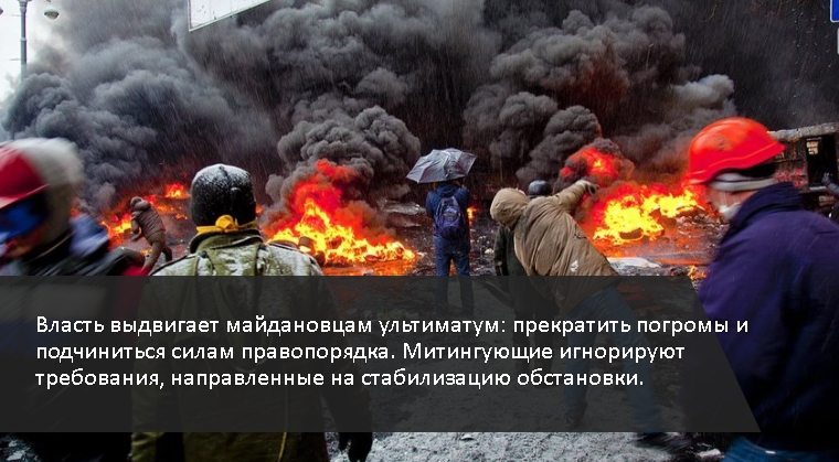 Сначала участников митинга насчитывалось не более полутора тысячи человек, потом к ним присоединились несколько десятков тысяч, в конечном итоге на майдан вышло порядка миллиона человек. В середине декабря состоялись переговоры лидеров оппозиции и Януковича, власть против применения силы в разгоне протестующих и объявляет мораторий. Кроме этого, обещает не вступать в Таможенный союз (Россия, Белоруссия, Казахстан) и призывает к прекращению противостояния. Но в январе следующего года интенсивность протестов возрастает, а 19-го числа начинается активное наступление, радикалы вооружаются камнями, дубинками, коктейлями Молотова, самодельной артиллерией. Ситуация вышла из под контроля. В результате столкновения появились первые жертвы с огнестрельными ранениями. 24 января повстанцами были захвачены Дом Украины, а так же, здания — Кабинет Министров, Министерство юстиции и Министерство аграрной политики. На площадях и улицах полыхают баррикады.