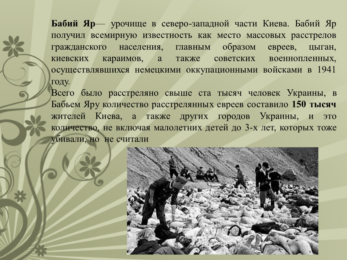 В планах немецкого командования было разделения Украины на зоны после ее оккупации в соответствии с указом Гитлера. После вторжения летом 1941 года нацистами уничтожено порядка миллиона численности населения, многие были угнаны в концлагеря, проводились массовые казни. В большей степени геноцид проводился против евреев.