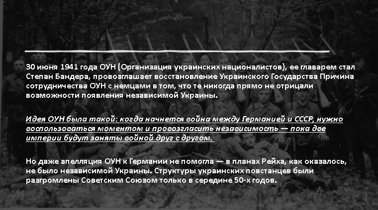 Украинские националисты не оставляли идею создания независимого государства. Они выступили на стороне Гитлера, многочисленным преступлениям, которые они совершали, нет оправдания.