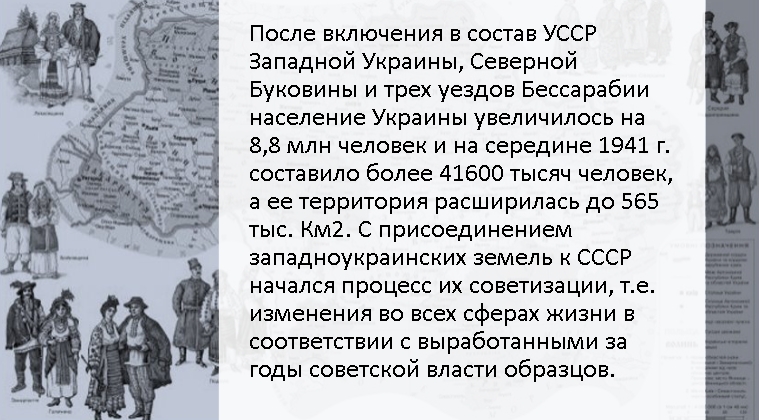 Чтобы узаконить свои права на территории Западной Украины, 22 октября состоялись выборы в Народное собрание, в конце месяца принята Декларация о принятии территорий Западной Украины в составе Советского Союза. А в ноябре были приняты законы сессией Верховного Совета СССР и УССР. Созданы области: Дрогобычская, Ровенская, Тернопольская, Волынская, Станиславская, Львовская. Далее, приблизительно через год, в состав УССР была включена Черновицкая область (бывшая Северная Буковина), а, так же, Измаильский, Аккерманский и Хотинский районы (уезды Бессарабии).