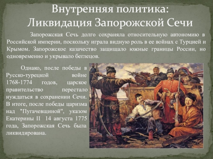 Конец Казатчины наступил во времена Екатерины Второй, которая своим указом лишила казаков власти на своей земле и разрушила Запорожскую Сечь. Украина становится окончательно Малороссией и лишается независимости.