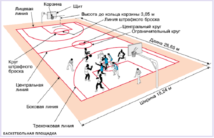 Какой должен быть размер площадки для баскетбола, схема с расстановкой