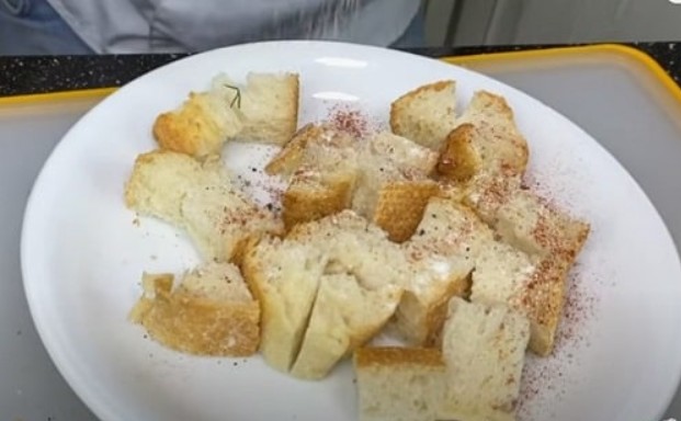 • Порежьте белый хлеб на кубики и подсушите их в духовке при t 160 градусов минуты три, обсыпьте перцем, сушеным чесноком, перцем и солью.